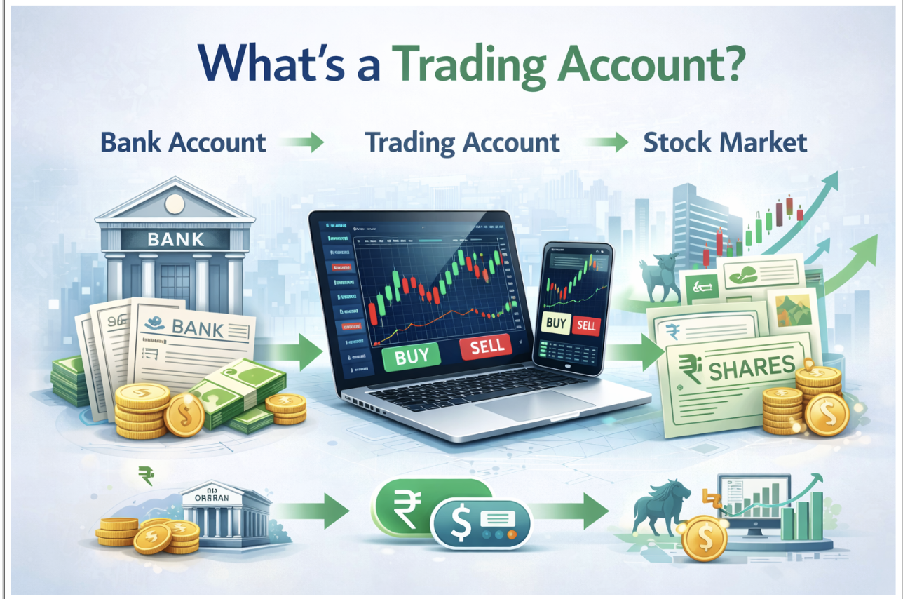 You use your trading account to place orders. It connects your bank to your Demat account. When you buy shares, money moves from your bank to your trading account, and then shares show up in your Demat account. When you sell shares, they leave your Demat account, and the money lands back in your bank.